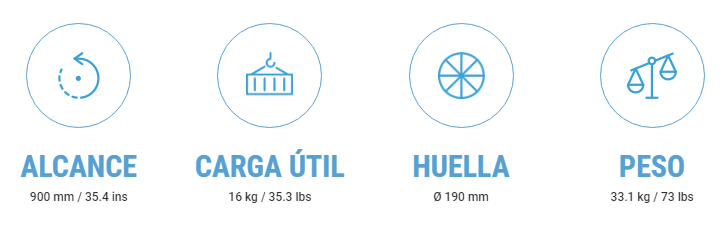 Con carga útil de 16kg y un radio de acción de 900 mm, automatiza procesos que involucran uso de máquinas pesadas, manipulación de materiales, packaging, embalaje, aplicaciones de atornillado y tuercas.